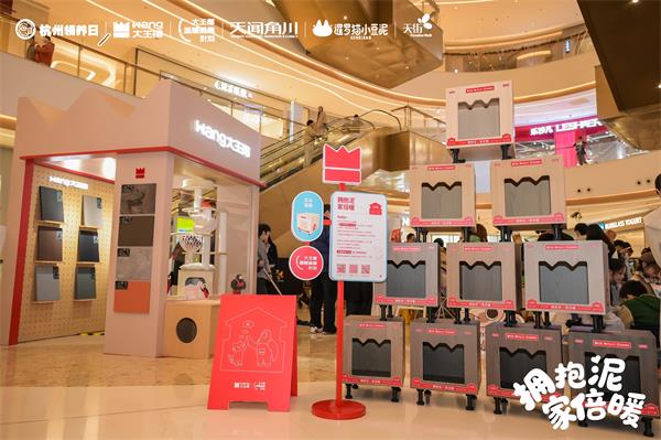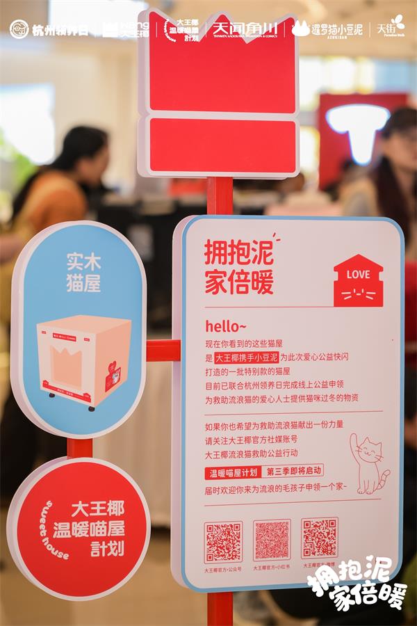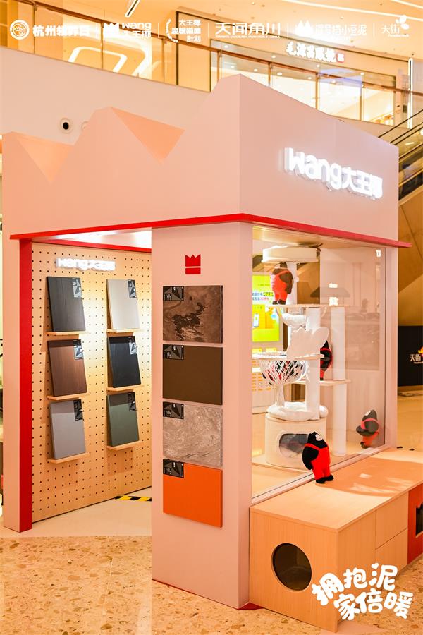 而这一次,大王椰选择用旗舰系列新品为它们打造一个安全又美观的"家"。2025年冬日,大王椰第三季“温暖喵屋计划”预热开启,品牌联合杭州领养日、治愈系IP“小豆泥”,于龙湖杭州西溪天街打造了一场限定公益快闪。活动现场不仅设有流浪猫领养区、爱心义卖区、公益打卡墙,更以大王椰巨型猫屋为视觉核心,将旗舰系列板材以场景化、家居化的方式融入空间陈列。