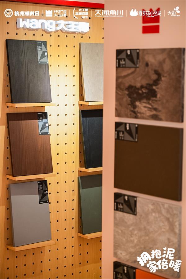 活动现场设置的“巨型猫屋”,不只是打卡点,更是一个“会说话”的产品展台。“巨型猫屋”采用的旗舰系列板材,是大王椰2025年度战略新品,也是品牌确立设计、美学赛道后的全新力作。该系列包含木纹、岩纹、纯色等多种饰面花色,材质涵盖双饰面和PET两大类,花色设计源自欧洲原创,承载着艺术、科技与自然共生的美学理念,呼应了当下高端消费者对“灵动自然”、“生态感”家居美学的向往,在视觉上建立了“高颜值”认知。