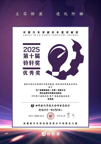 近日,中国汽车零部件供应链权威奖项“2025铃轩奖”评选结果重磅揭晓。长广溪智造凭借CGXi Inside智能座舱系统中的两自由度中控屏运动机构,从激烈竞争中脱颖而出,荣获“2025铃轩奖量产类优秀奖”。这一殊荣不仅是对长广溪智造技术实力的权威认可,更标志着公司在汽车智能部件领域的创新突破。